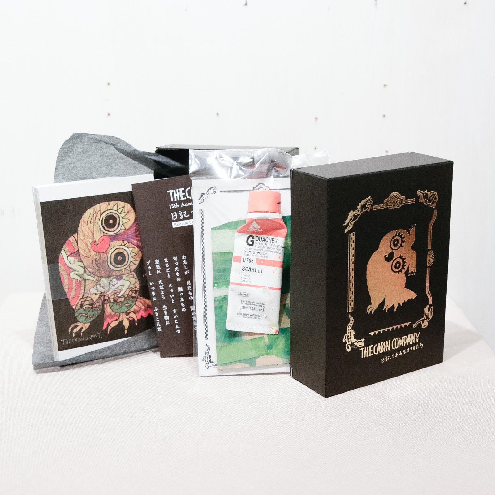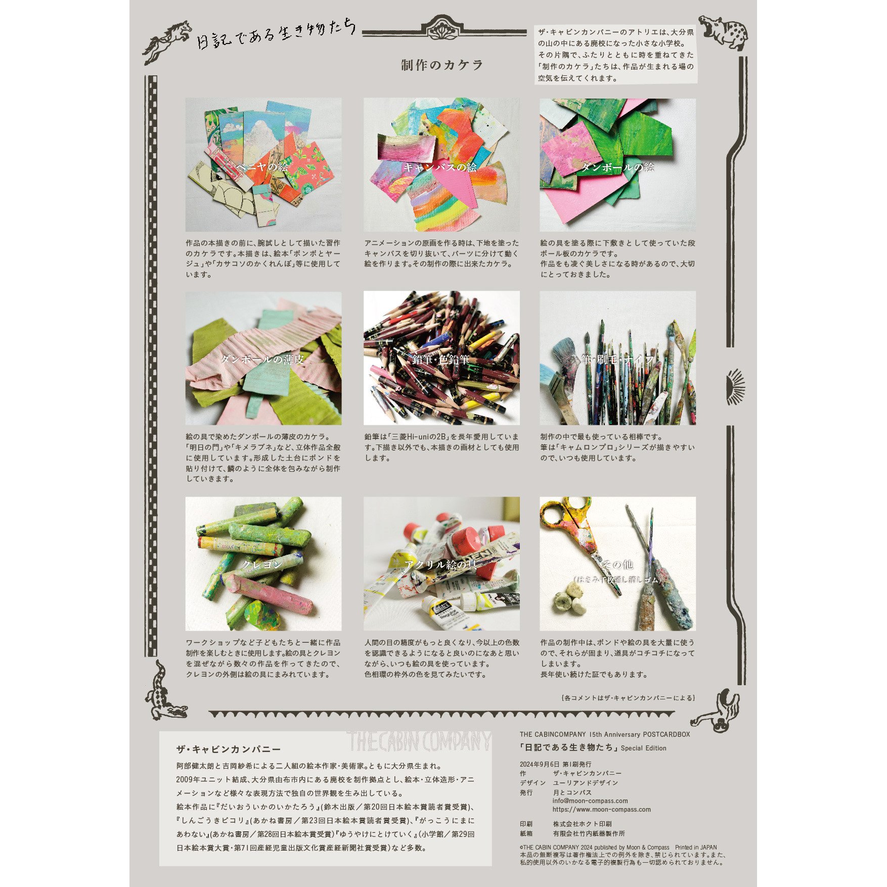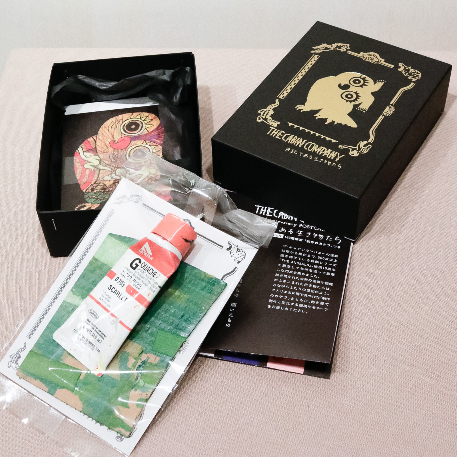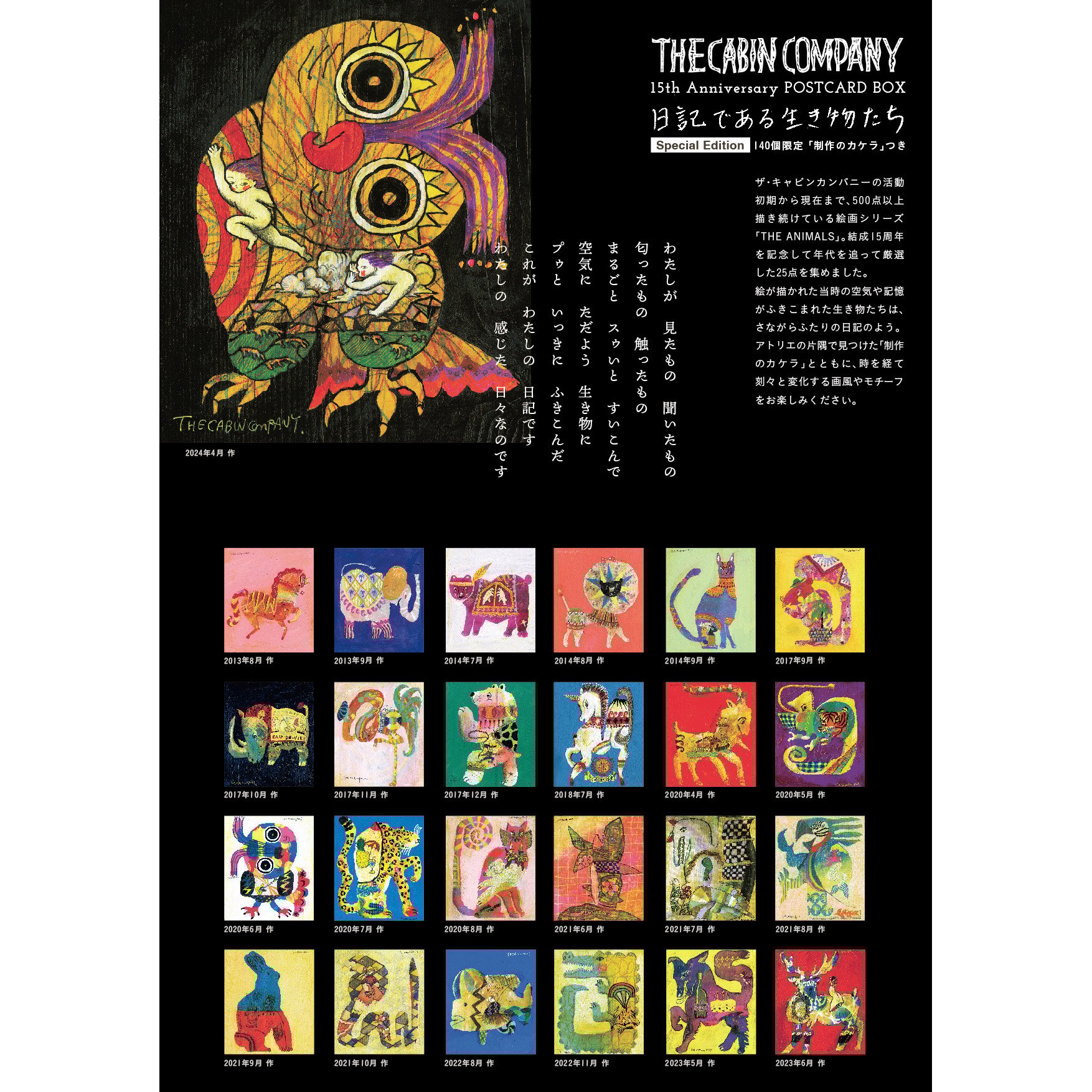 活動初期から現在まで、500点以上描き続けている絵画シリーズ「THE ANIMALS」。厳選した25種の特製厚手ポストカードセットに、大分のアトリエで見つけた「制作のカケラ」密封保存して特製BOXにおさめました。